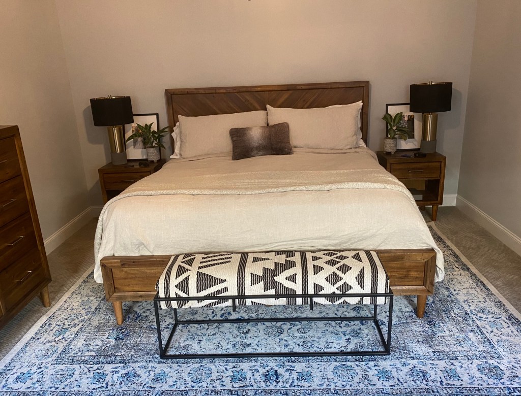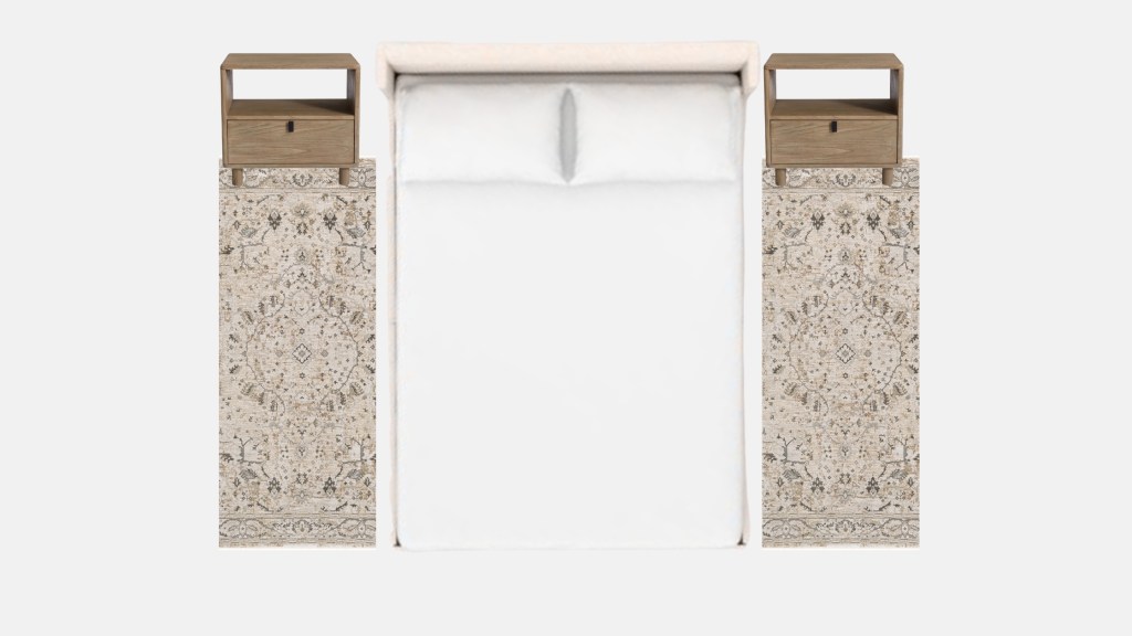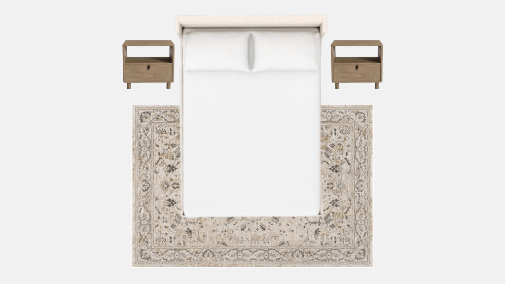 In a bedroom, you generally place the rug underneath the bed or on the sides of the bed as seen below ⬇️
