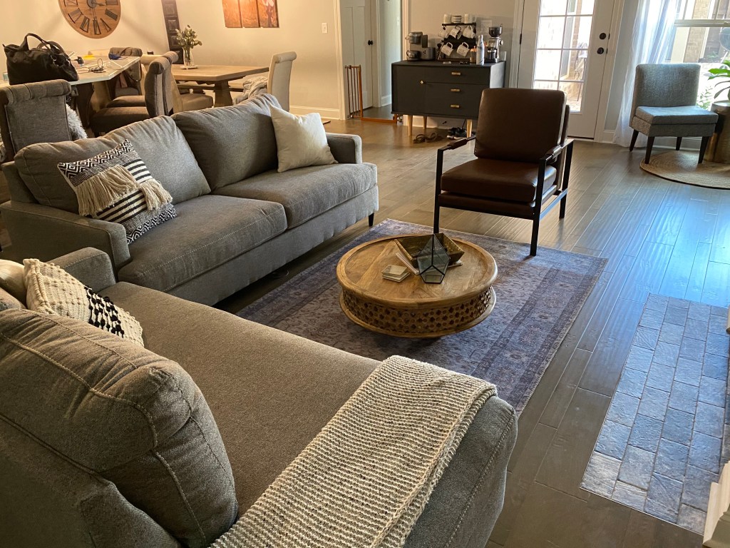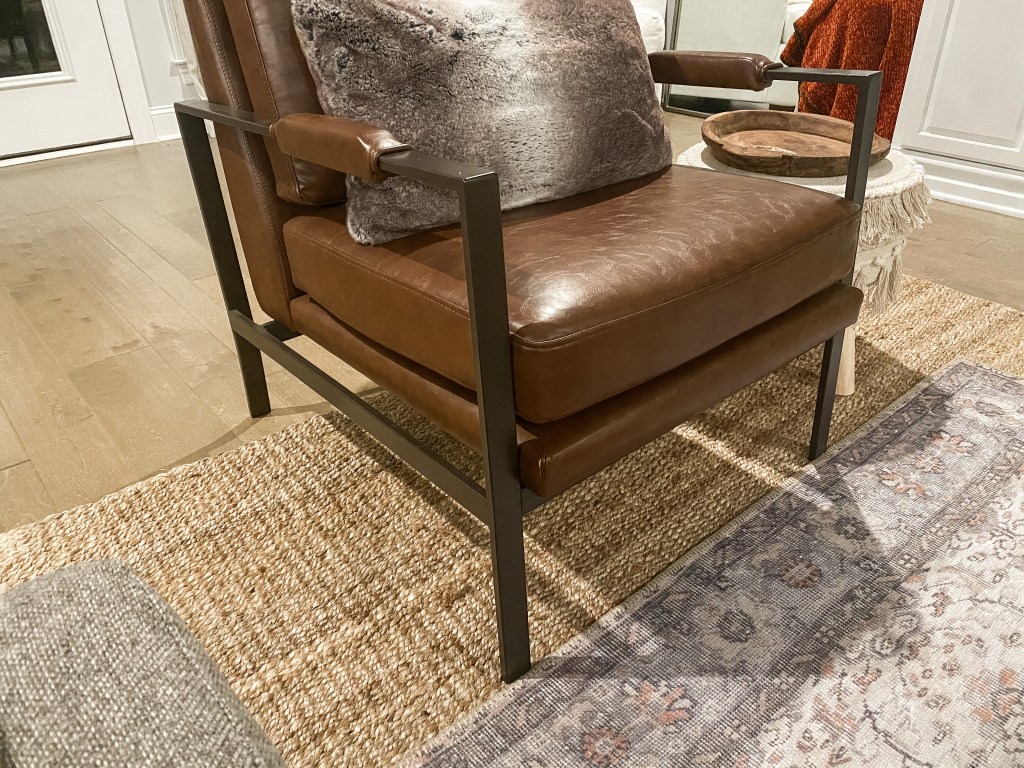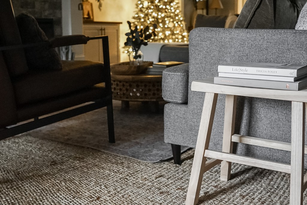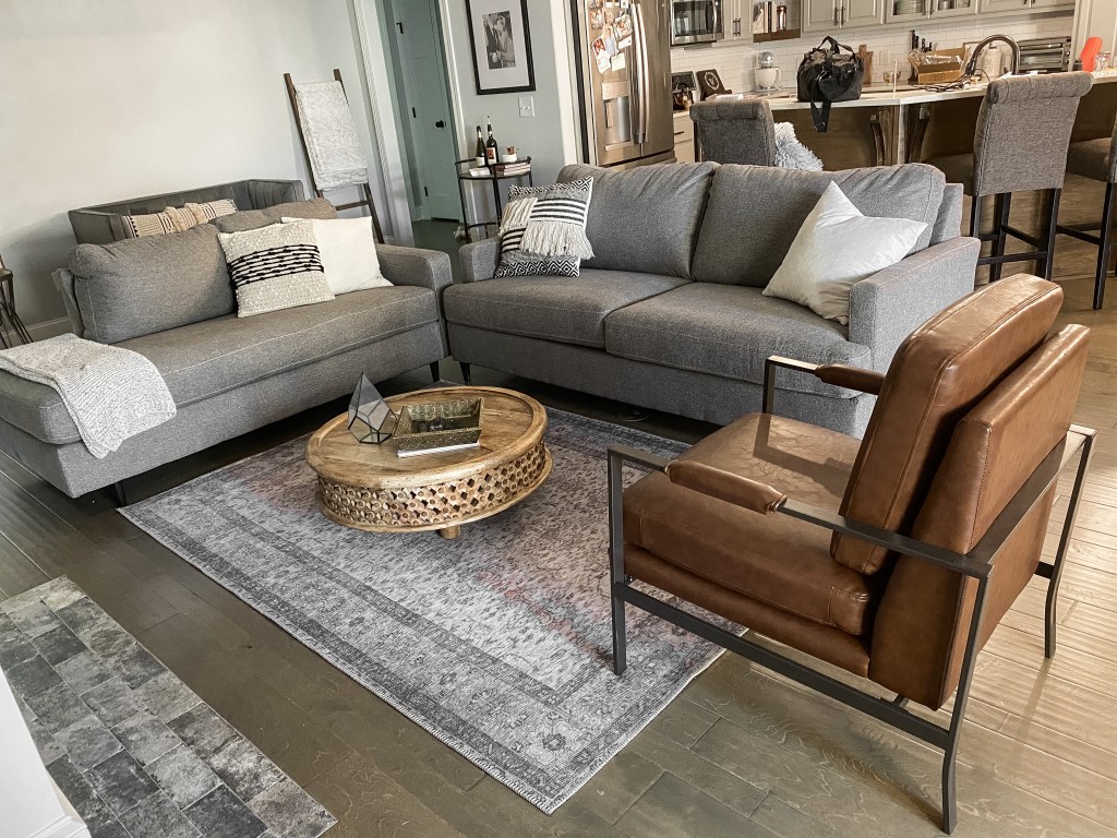 The key to this set up is to be consistent. If one piece of furniture has two legs on the rug, the other pieces should only have two legs on the rug (if possible). You’ll notice in some of my photos, our leather chair is NOT following this rule, and it kind of looks weird, because both of our sofas only have two legs on the rug, while the chair is all the way on. You’ll have to excuse how it is in the photos…we move this chair around when we have guests over so that it faces the TV, and it doesn’t always get moved back into place (and I didn’t notice until after I took all the pictures). Good thing houses are for living and not for being perfect all the time! Can I get an Amen in the comments if your house isn’t always perfect? 🙋♀️