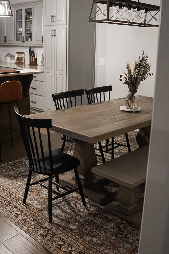Once you have measured and know a minimum size for keeping your table and all chairs on the rug, the size of your space is the determining factor. Generally, you want to try to keep enough room around the edges to be able to pull out and push in the chairs without tripping on or messing up the rug. You also want to consider how close your rug is to the wall. As I mentioned earlier, the point of the rug is ground your space and anchor your furniture, so you don’t want it to look like wall to wall carpet. There are some guides that recommend at least 12″-15″ of clearance between the wall and the rug, but this isn’t always possible, especially if you have a smaller space. I say go with what works best in your space without touching any walls and keeping as much furniture on the rug as possible!