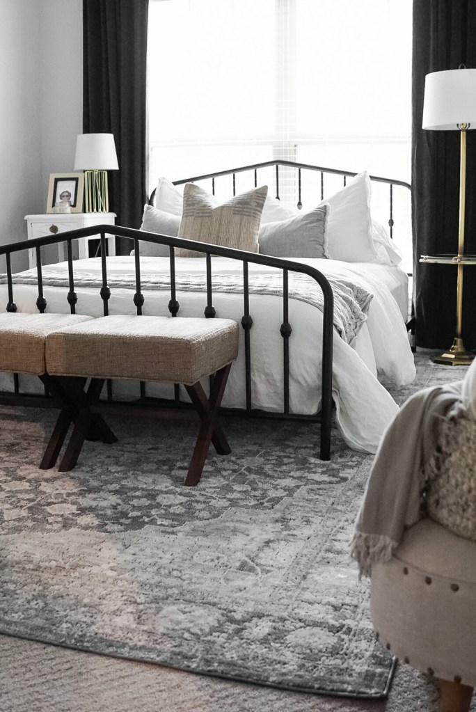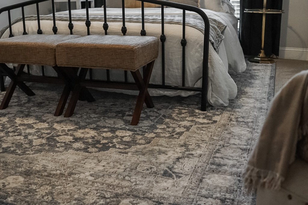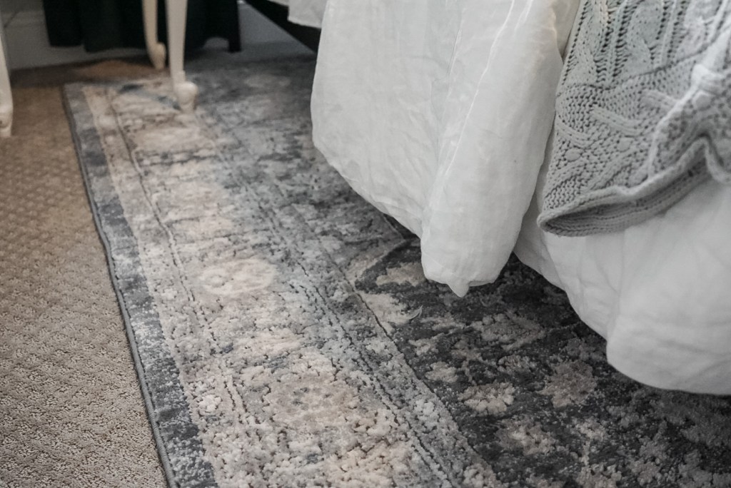 If you’re going for the all the way under look, you will generally need a larger rug. For our guest room shown below, we used a 7.5′ x 11′ rug placed all the way under our queen bed, and oriented it vertically to fit the space. If we would have oriented it horizontally, we would have had to go with the partially under look to have the right amount of rug extending from the bed. As a general rule of thumb, you want to have at least 12″ between the end of the rug and the end of the bed, and you want to make sure that your rug is wider than the bed, but does not extend beyond the night stands.