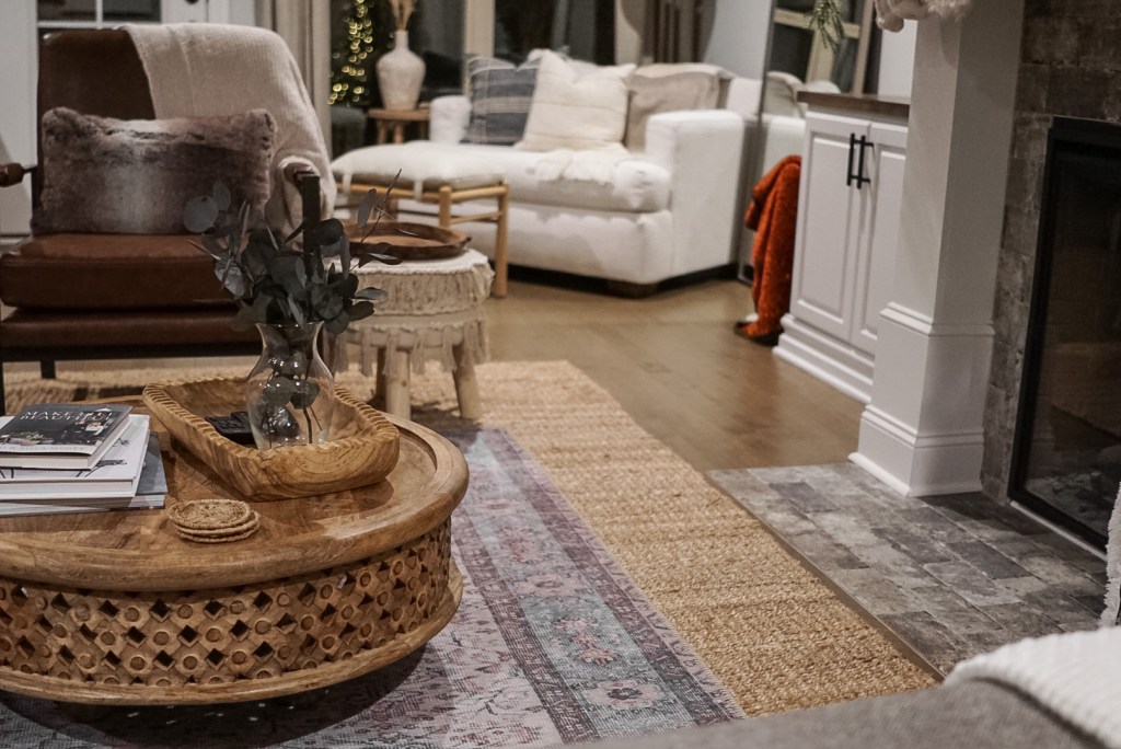 As you read earlier, we originally ordered our vintage style 5′ x 7′ rug thinking it would be large enough to fill our space. When our new furniture arrived, we quickly realized that we needed a much larger rug, and decided to go with a 9′ x 12′ jute base. Layering the 5′ x 7′ off center just in front of all the furniture worked out perfectly for us, because it allowed us to access the floor plug underneath our sofa through a small hole we cut in the jute rug. If we had gone any larger with our top rug, for instance, an 8’x10′, we would not be able to use our floor plug. If we had gone any smaller, however, our chunky coffee table and large base rug would have overwhelmed the accent rug. Function is just as important as aesthetics when it comes to rugs, so choose what works best for your space!