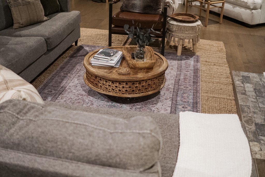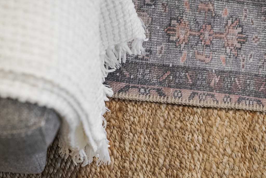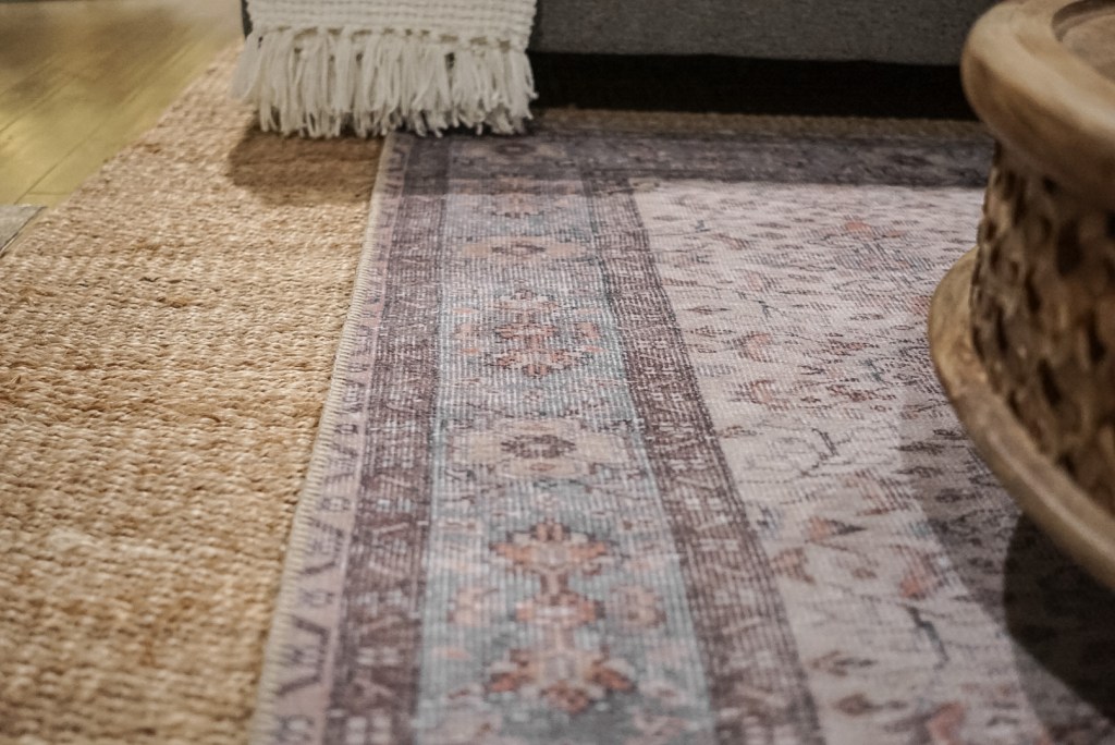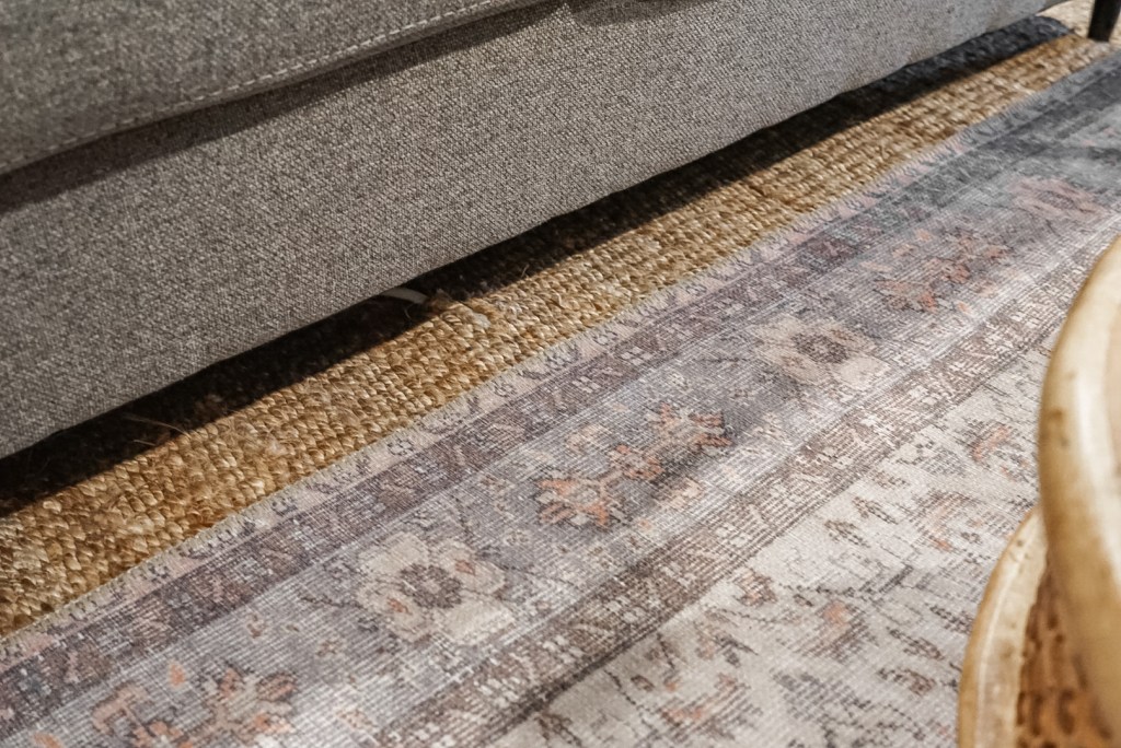 Second, choose rugs that have completely different textures and piles for layering. For example, you wouldn’t want to put two flat weaves or two natural fibers on top of each other. For our layered look, we went with a natural jute rug on bottom and a vintage style flat weave on top.