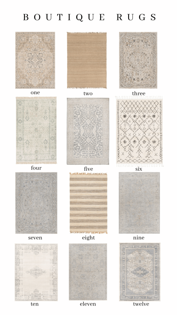 I’ve created three rug guides that include the rugs shown in our home, my favorite Loloi rugs on Amazon, and my favorite Boutique Rugs! To shop for any of these products, click the corresponding name or number below each guide.