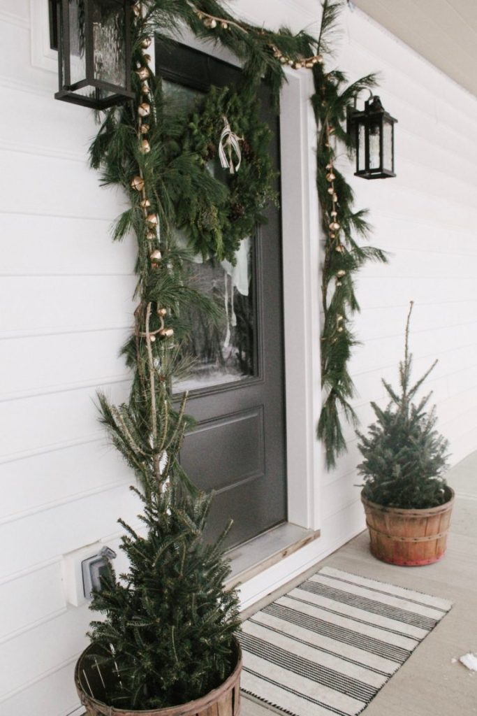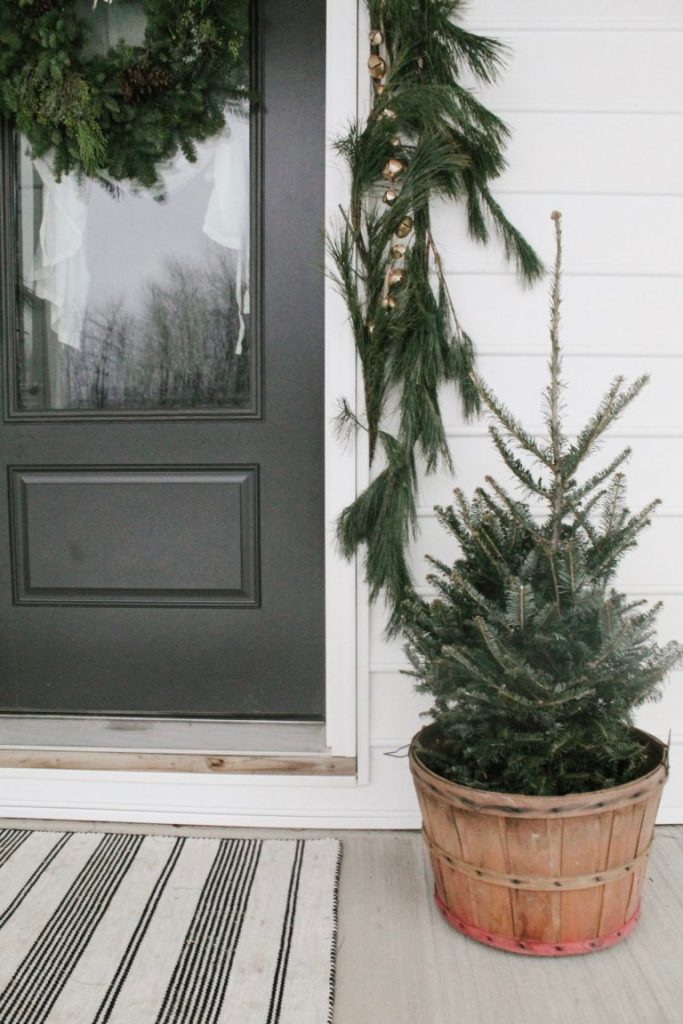 Seasonal plants or small trees are an easy, affordable way to bring the holiday feels to your small porch! Real or fake, plants and trees go with any style, and you can find just about any size you need to fit in your space. You can’t go wrong with a Christmas tree in a cute basket or pot, or a smaller potted pant on a stool or table!