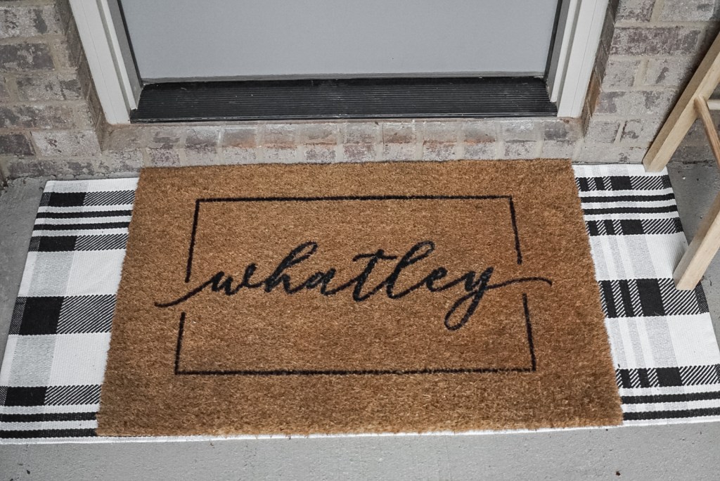 If you read my last post, y’all already know I love me some layered rugs, and outdoor rugs are no exception! I love using this custom doormat we received as a wedding gift over a patterned rug to change up our porch look for the seasons! In the Spring and Summer, we used a black and white striped rug (shown earlier under the “Sleigh All Day” doormat), but for the fall and winter, I decided to go with a plaid rug to mix it up! As I mentioned earlier, this custom doormat was a gift, but you can order it on Etsy in a few different designs for $56-$66 depending on the size. It is a little more pricey than your average doormat that you might find at Target or Hobby Lobby, but it is totally worth it in my opinion, because it is amazing quality and you can use it all year long. Our doormat has been heavily used everyday for the past year, and it still looks good as new! The plaid rug layered beneath the mat is from Amazon, and was only $20.99!