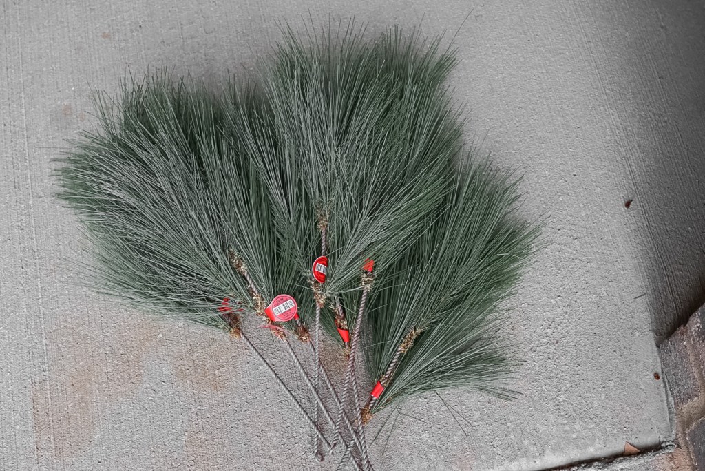 That is where the wreath picks come in! I found these individual pine wreath picks shown below at Hobby Lobby. They were originally $2.99 a piece, but I caught them on a half off day, so they were just $1.50 each! I originally bought 7 of them, and had to go back and get a couple more to finish off my garland, but they seriously made such a difference in the over all look! To attach them to the main garland, I wrapped the bendable, wire stem around the wire part of the garland, and used the branches of the garland to cover up any of the wire that was showing.