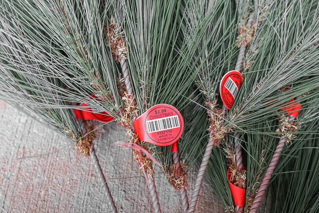 This is a super easy way to make a really cheap garland look more expensive. You could add in eucalyptus, cedar, bells, berries, you name it! You could even use floral tape to add in some fresh stems if you had some on hand that you wanted to use.