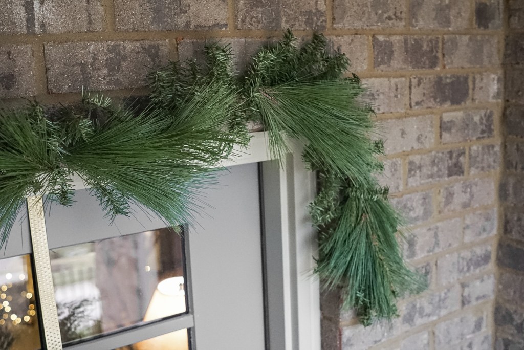The garland shown around our door is actually a combination of garland and wreath picks! The garland we used is from Lowe’s and was $5.98 for a 9 foot strand (we used 2 strands). You can’t beat that price for 9 feet of faux garland, but I’ll be honest… you get what you pay for. It’s not the worst looking garland I’ve ever seen, but certainly not the best, so I felt like it needed a little something to take it to the next level!