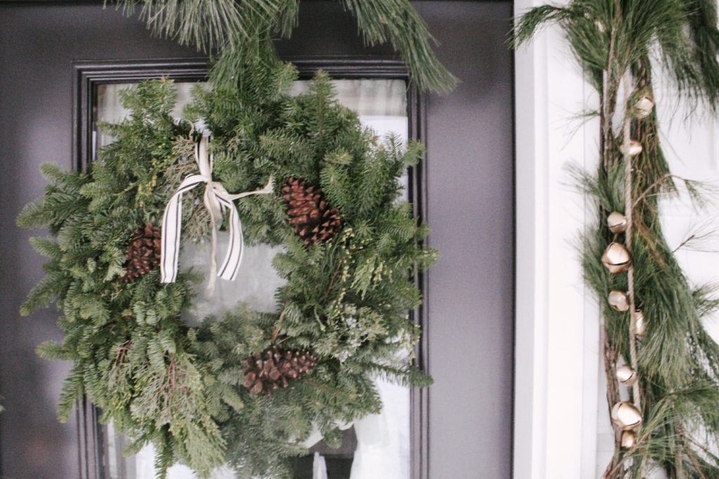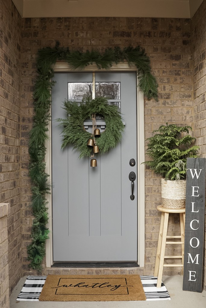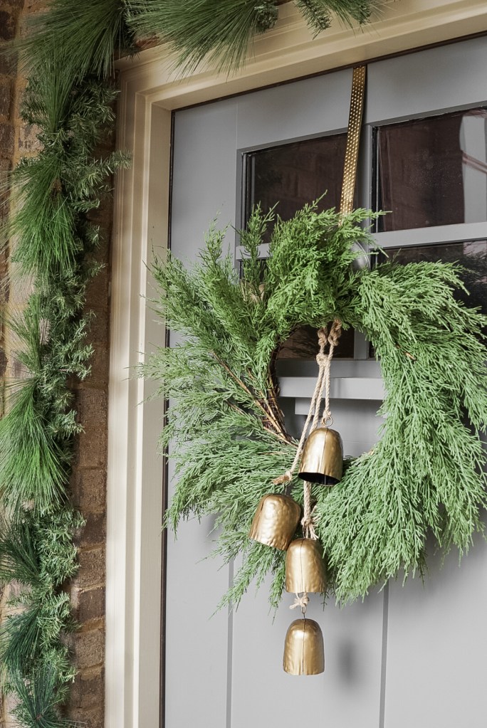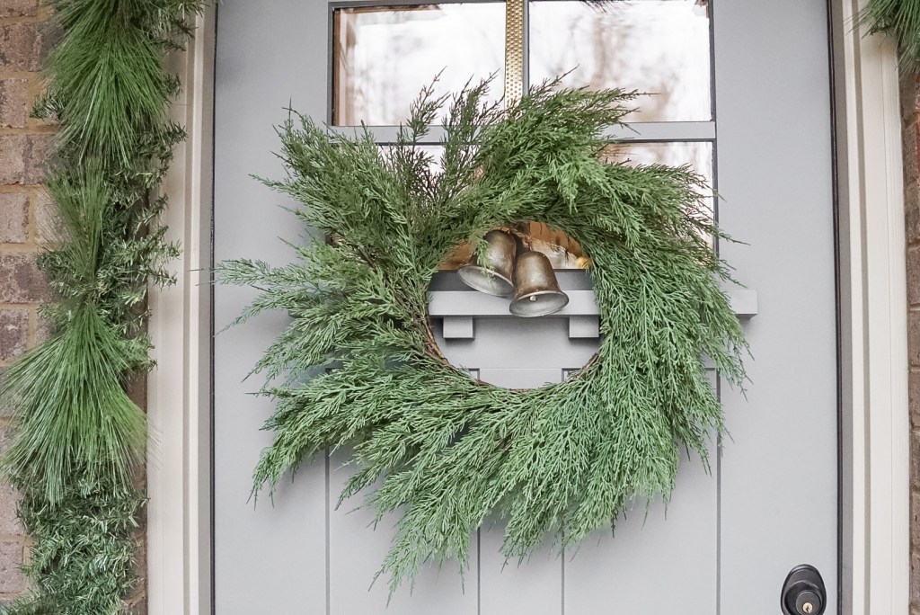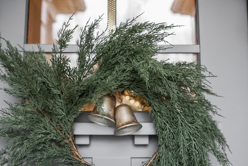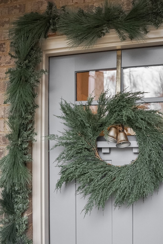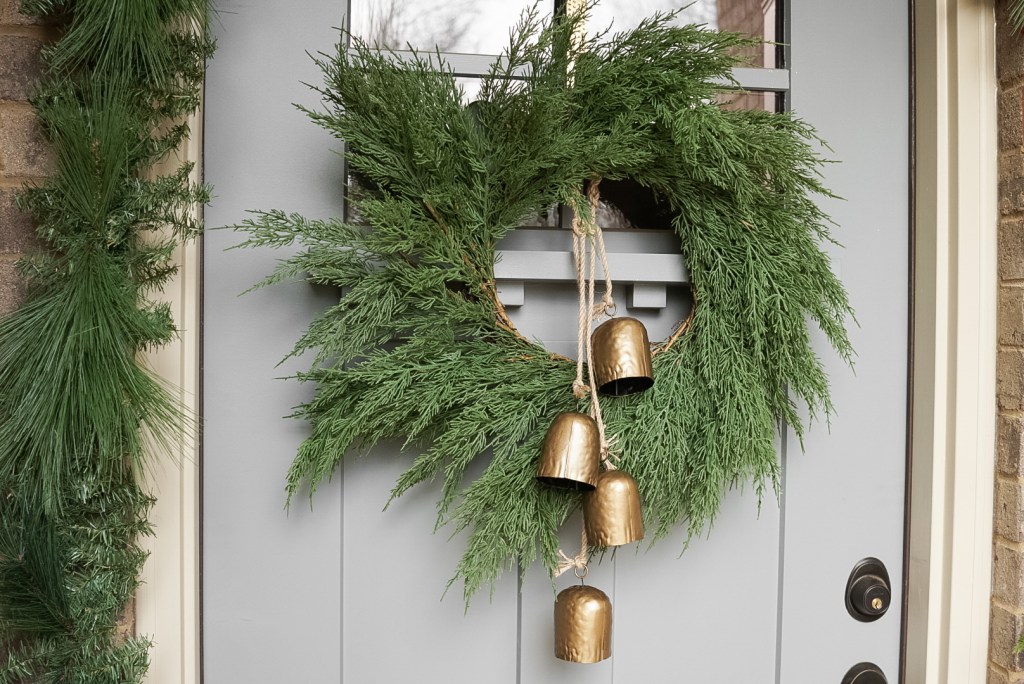Okay, so you’ve probably noticed two different wreath looks throughout this post. It’s the same wreath, but just shown with two different sets of bells! Our wreath came from Marshalls and was $29.99. I love the simplicity of this wreath. It is classic, realistic, and good quality, so I know I will be able to use this for years to come! While I do love the simplicity, I felt like it needed just a little more detail and dimension to give it that designer look, hence, the bells! Both of these sets of bells were DIYs (you can see how I did them in this blog post) and were super affordable designer dupes! The longer door hanger shown in the first photo is a set of black bells from Joann’s that I spray painted, and they were on sale for $7.99 when I got them! The smaller set of two bells are from Michael’s and were on sale for $4.99 when I got them! Both were spray painted with Rustoleum’s Satin Bronze Metallic Spray Paint ($6.99).