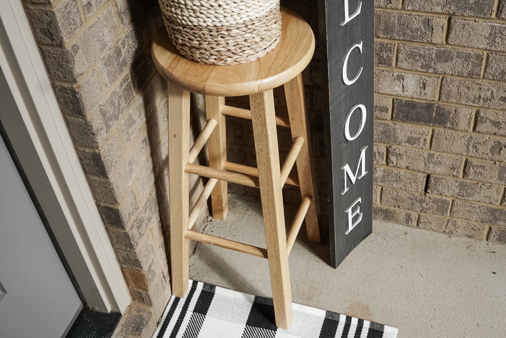 Okay, y’all know I love me some Facebook Marketplace, and that’s exactly where I found this little stool, for just $5! I have seen all sorts of wooden bar stools on marketplace lately for $5-$10, so these are a great affordable option to add to your small porch decor! You can also find some affordable stools on Amazon. If you see one you like but don’t love the color, you could always sand and re-stain it, or even spray paint it a solid color!