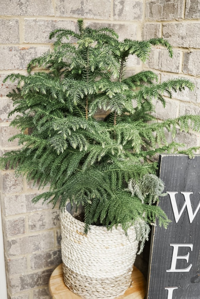 I wanted to incorporate some real greenery into our winter porch decor through the use of a plant! I found this cute little Norfolk pine at Lowe’s for just $19.99, and fell in love with it! I love the feel and look of it’s branches, and it’s a little bit of a different look than your everyday average Christmas tree! I found the basket pot at Hobby Lobby (half off) for $12.99!