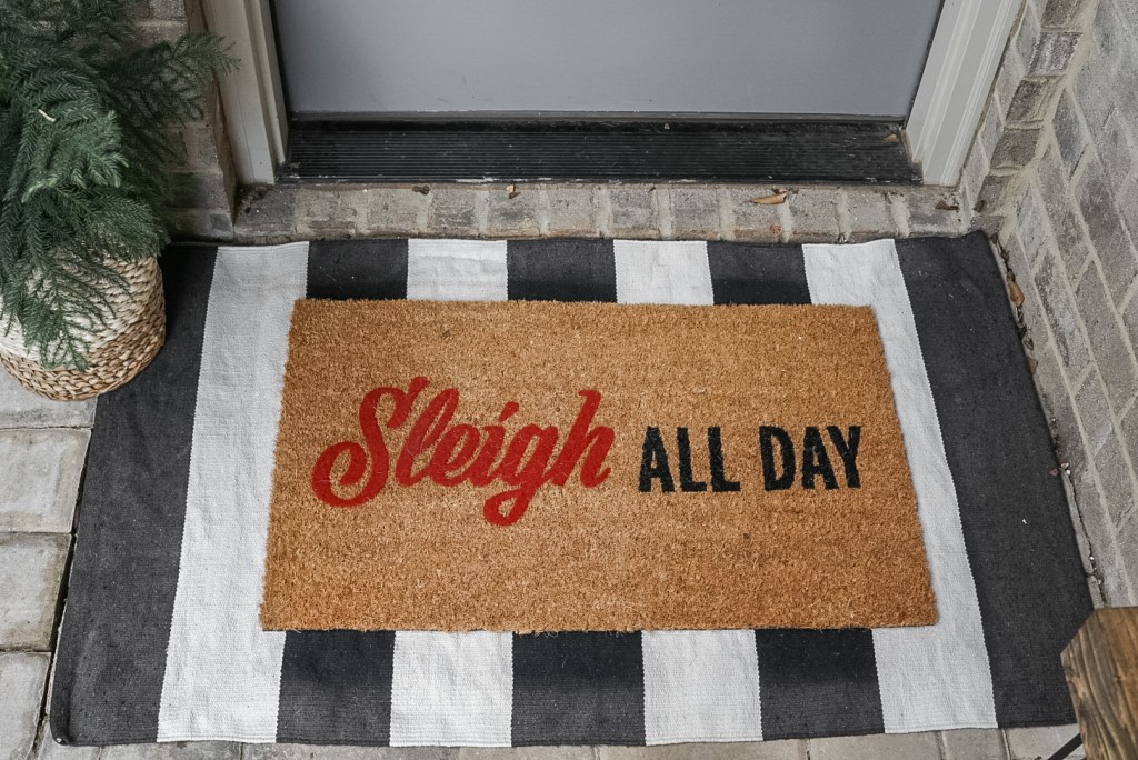 Just like with wreaths and garlands, a rug or doormat will fit on even the the smallest of porches! This is the perfect way to add color, pattern, and a festive saying to your porch design, while tying everything together! Plus, you need somewhere to wipe the snow (or Alabama clay in our case) off your boots right?!
