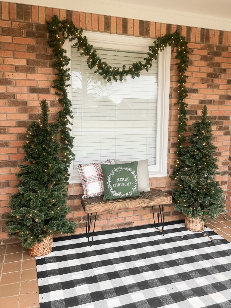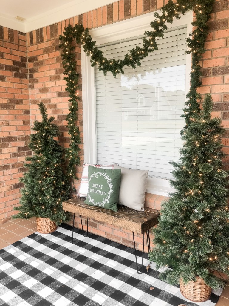 Okay y’all, this is my best friend’s porch and it is SUCH a great example for those of you with a small front porch that is centered on a window rather than a door! This 3’x5′ buffalo plaid rug grounds the space perfectly, while the placement of the trees and garland help highlight the symmetry of the porch. The hairpin bench serves as both a functional furniture piece, as well as a place to display the cutest Christmas pillows from, you guessed it, TARGET! I will link her rug, pillows, trees, and garland at the end of this post for you as well!