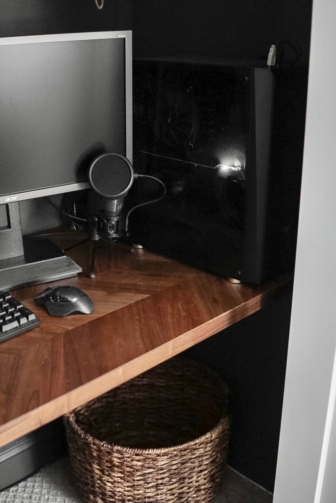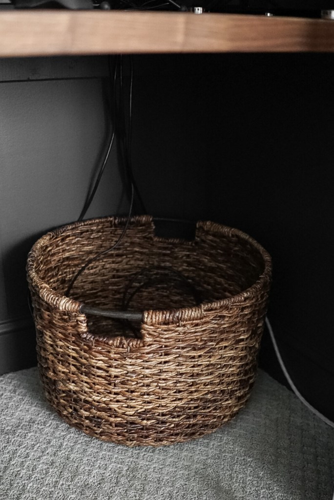 Another problem solved by the cloffice! I love being able to tuck the computer tower away so it is (essentially) out of sight, and we did our best to run the cords discretely through the back of the desk and hide them behind (and inside) this basket! You can read more details about this in the blog post found here. I also LOVE how the black monitors and cords blend in with the dark and moody wall color. It makes everything feel sleek and clean, unlike before when they stuck out like a sore thumb in front of the window.