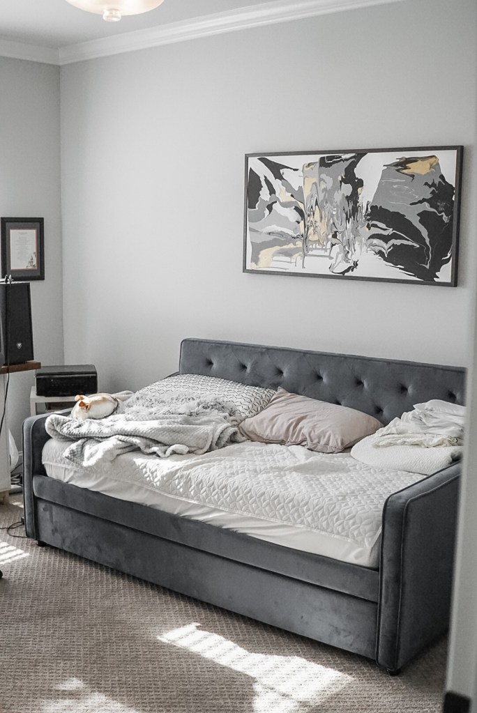Okay, so you know how I felt about the daybed for this space… It was hard to keep made (because it was primarily used as a couch), it always looked messy, it was too big for the space, and it was a hard color to design around… BUT it was great in the sense that it slept two people comfortably, since it had a trundle underneath!