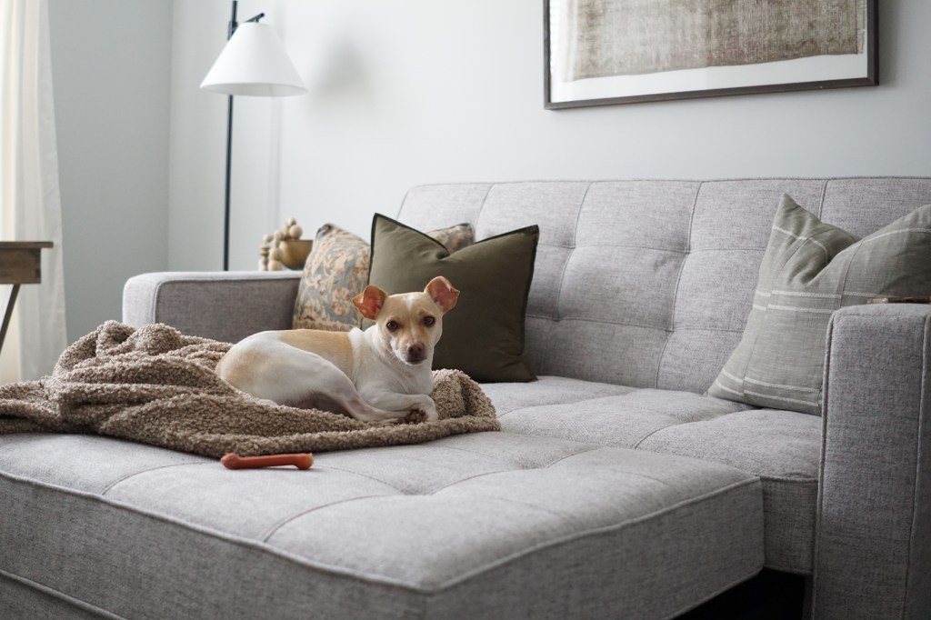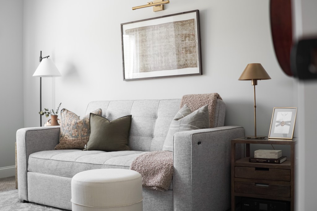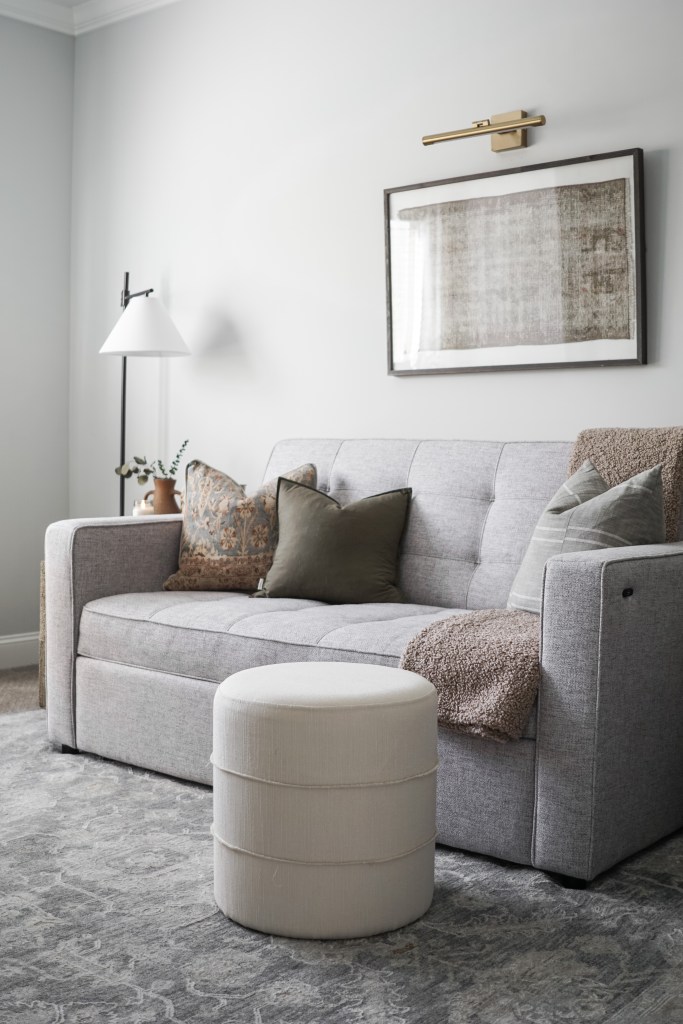 The thing that played the biggest role in creating a more neutral color palette for this room was getting rid of the royal blue daybed and replacing it with this heather gray sleeper sofa. By doing this, we created a neutral base that we could build on with textiles and accent decor to bring in colors, patterns, and textures that would create a cohesive look.