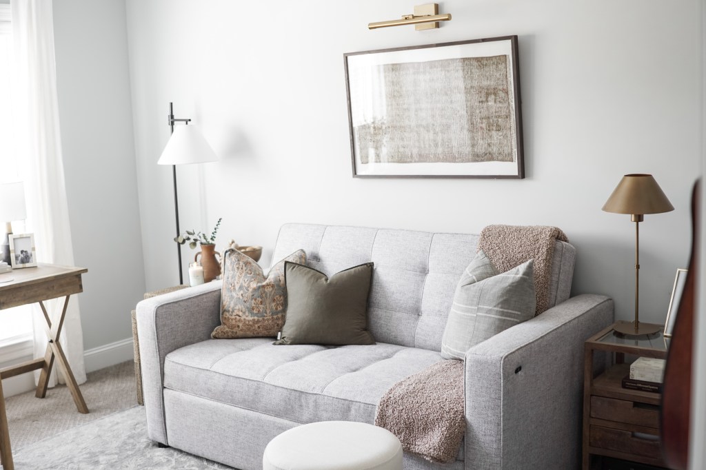 I knew I wanted a more neutral color palette in this space, so I wanted to find a sleeper sofa that was neutral, modern, and queen sized so it could sleep two people. Oh, and I really wanted it to cost less than $500… which is totally unrealistic and pretty much impossible to find (unless you’re searching on Facebook Marketplace, and believe me, I looked and looked, but didn’t find what I was looking for nearby). So I had to up the budget just a little for that, but I found the perfect piece at a great price and I’ll tell you all about it a little later in this post.