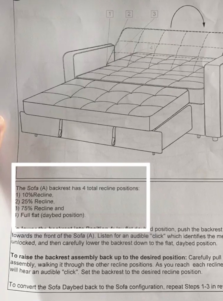 • It reclines to 10%, 25%, and 75% in addition to laying out flat to become a bed