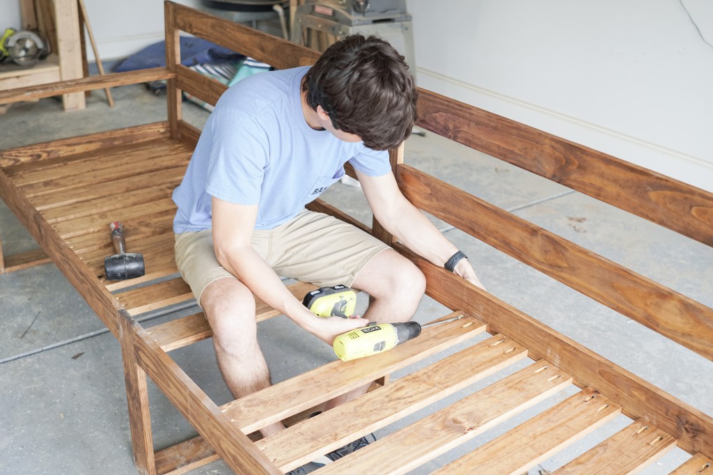 Other important things to remember here are to make the boards level with each other (so the mattress sits flat and even) and to make the bottom edge of the mattress supports flush with the bottom of the cross bars. Other than that, it’s a very repetitive process of leveling and screwing boards in 15 times.