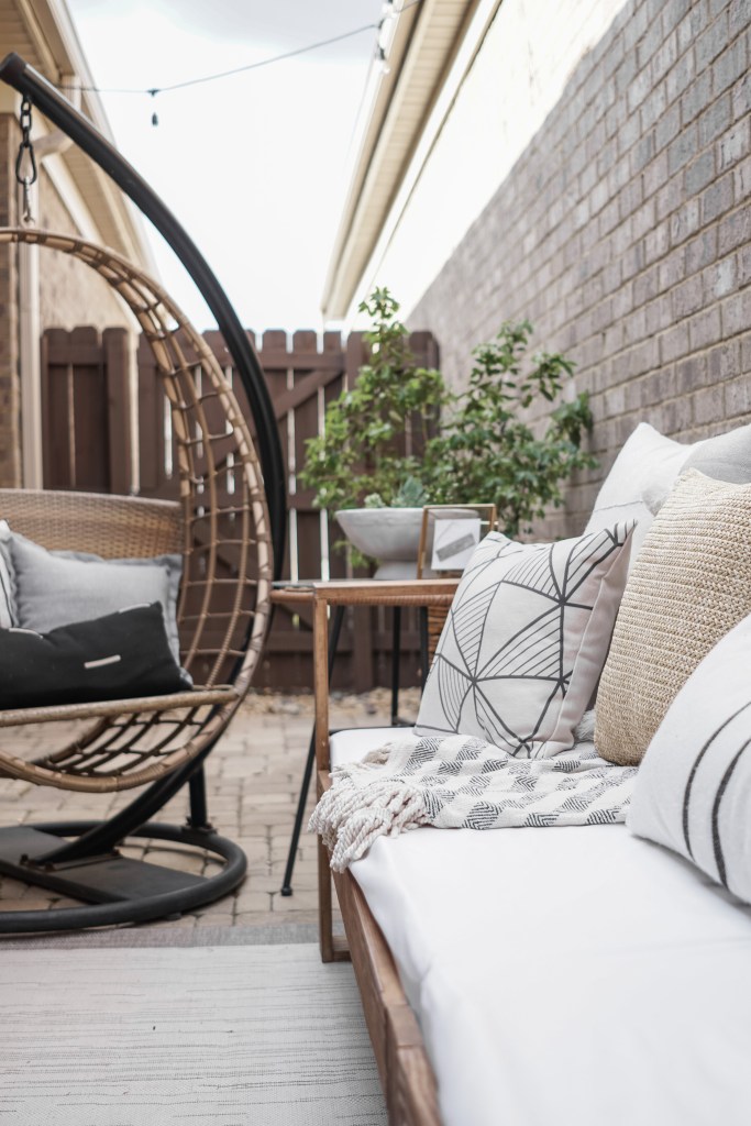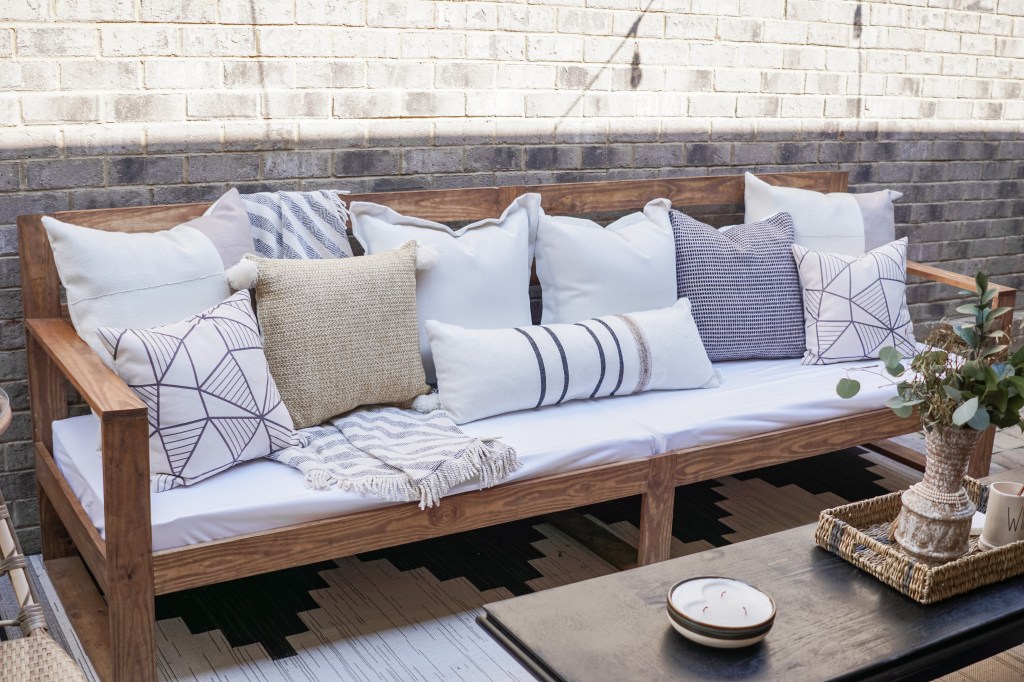 As far and back cushions go, you could definitely buy proper outdoor back cushions, but we decided to just use a bunch of outdoor throw pillows. I love how cozy all the pillows feel, and they all go together without being too matchy matchy (which is turning out to be a theme in our patio design). To be honest, it probably would cost about the same, and we spent about the same amount on pillows as we did on the wood + mattresses combined.
