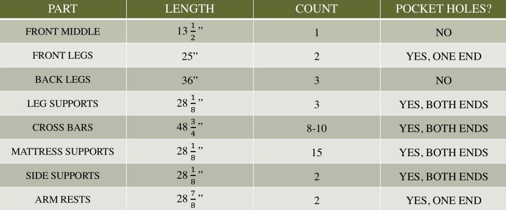 The cut list below is specific to the size of our outdoor sofa and the crib mattresses we used. The overall dimensions of our sofa are roughly 106″ long, 30″ deep, and 36″ high (from floor to the top of the back). The distance from the floor to the top of the mattress is ~16″.