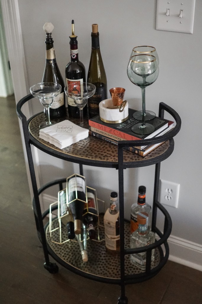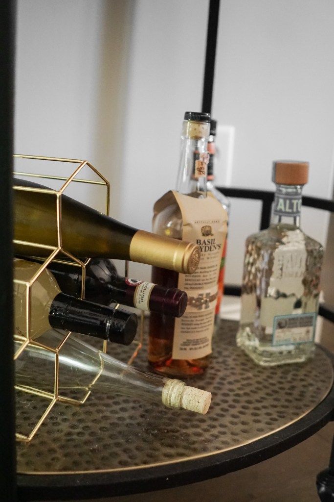Even with a small bar cart like ours, we were able to squeeze in this cute, honeycomb style wine rack on the bottom. It takes up a lot of space with practical storage, which is perfect if you’re struggling to fill up your bar cart. Pro tip for the white wine lovers like me who actually keep your wine in the fridge… save some of your empty bottles (especially the darker ones) and mix them in with full bottles that aren’t in the fridge to keep your wine rack looking full and stocked.