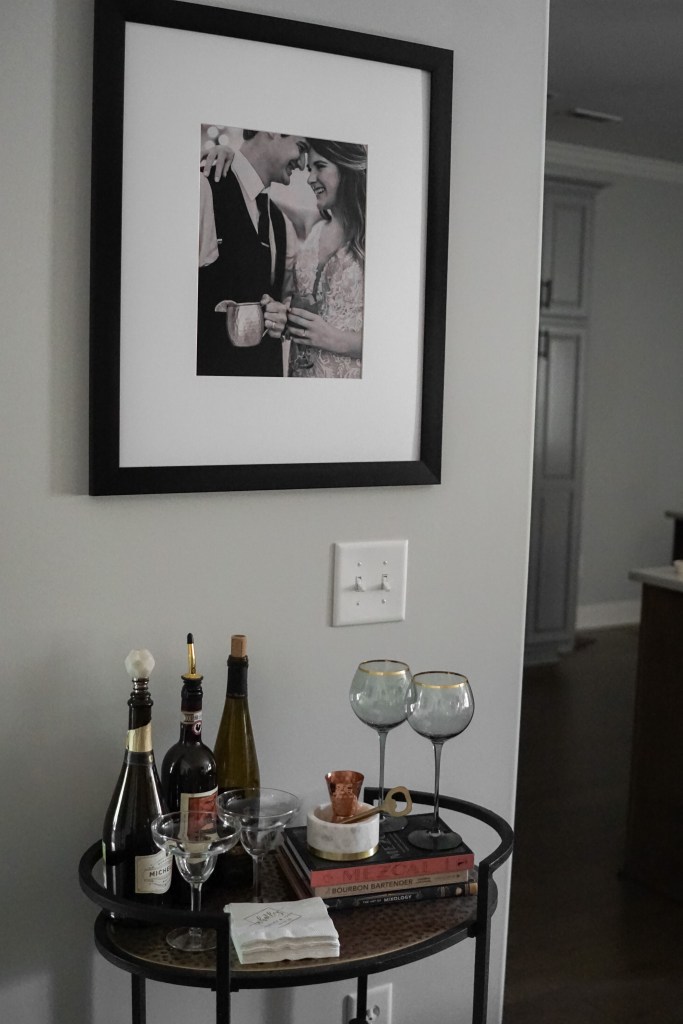 While we were planning our wedding, we were also in the process of building our house, and I had this vision of having a cute little bar cart with a black and white picture from our wedding hanging over it. We were planning on having signature cocktails, so I asked our photographer, Nathaly Norman (who is the best photographer ever), in advance to take some artsy shots of us on our wedding day with our favorite drinks to hang over our bar cart. These were some of my favorite pictures from our wedding day, and it was exactly what I had in mind for this space! I’m a pretty sentimental person, so I really love finding ways to display personal photos and sentimental items in our home in a subtle way, and this is definitely one of my favorites.
