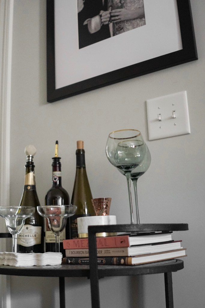 First up is glassware! A few pretty glasses are an easy, affordable, and practical element for styling your bar cart. You could use wine glasses, martini glasses, glasses from a special occasion, or even a glass decanter to turn your favorite liquor into a unique styling element.