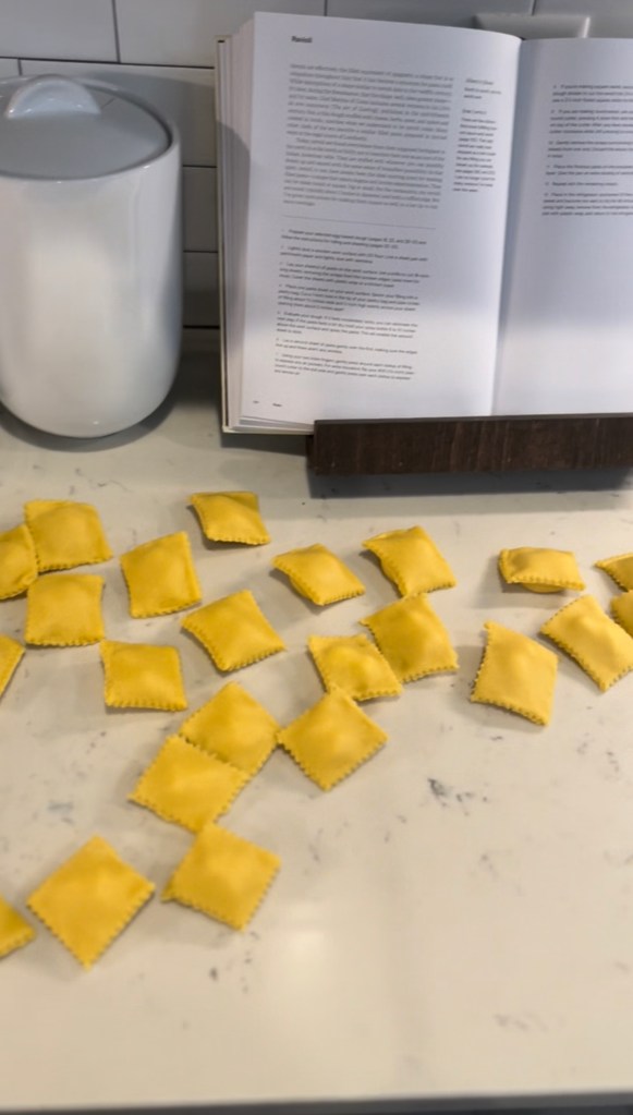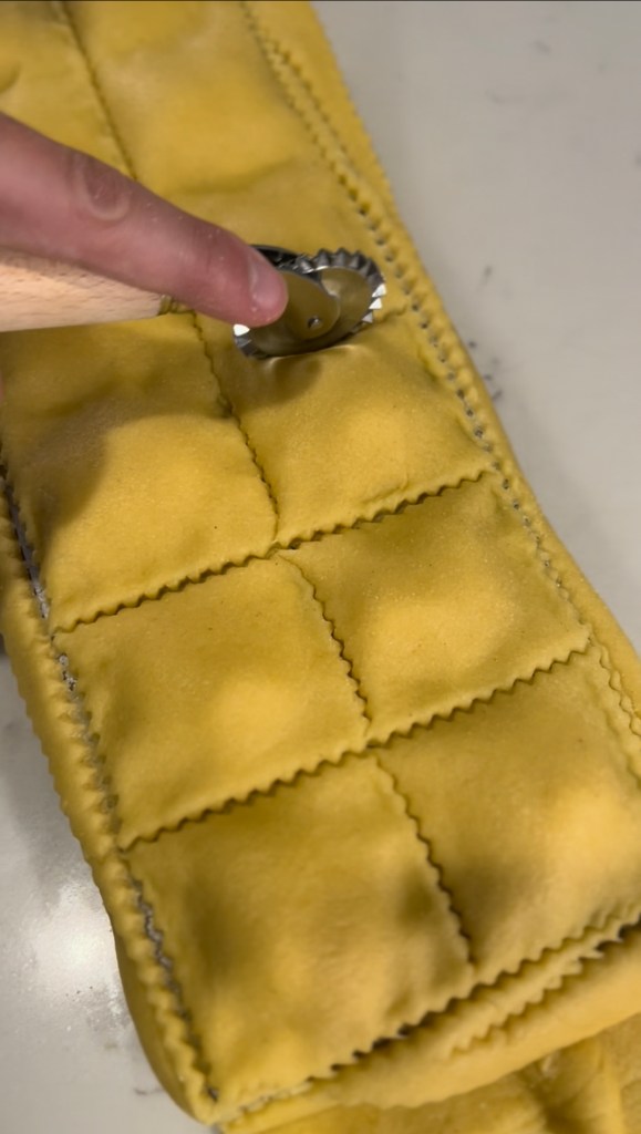 - Repeat steps 8 and 9 until you don’t have enough dough left to do so (note, these pieces will make up the top and bottom of your ravioli, so you need an even number)