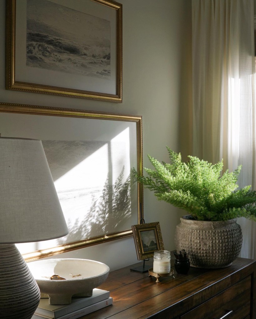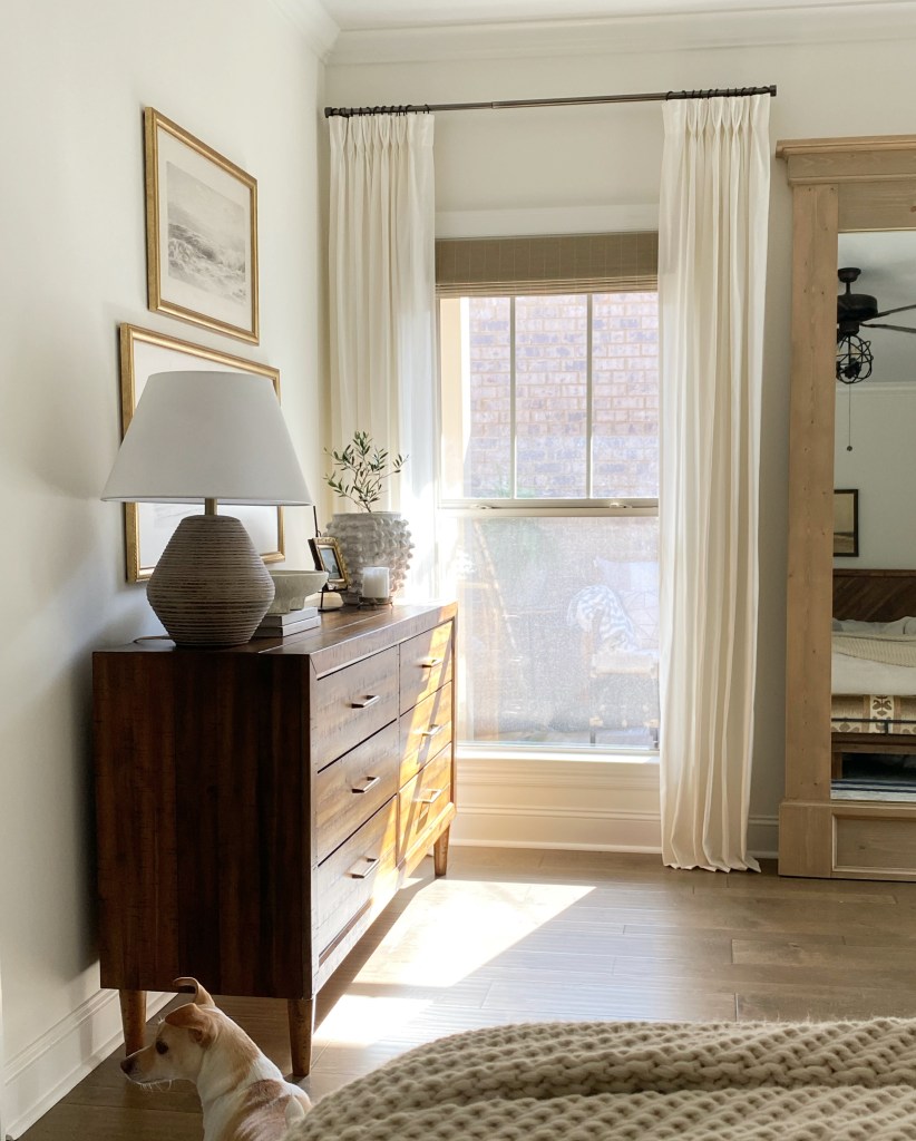 On the dresser, we added this Resin Table Lamp from Studio McGee’s line at Target. This lamp is an amazing dupe for the Shoppe Amber Interiors Calabria Reggio Table Lamp and is less than 1/6 of the price. In this spot, the lamp functions more as accent lighting rather than task lighting, and I love the way it illuminates this vignette at night.
