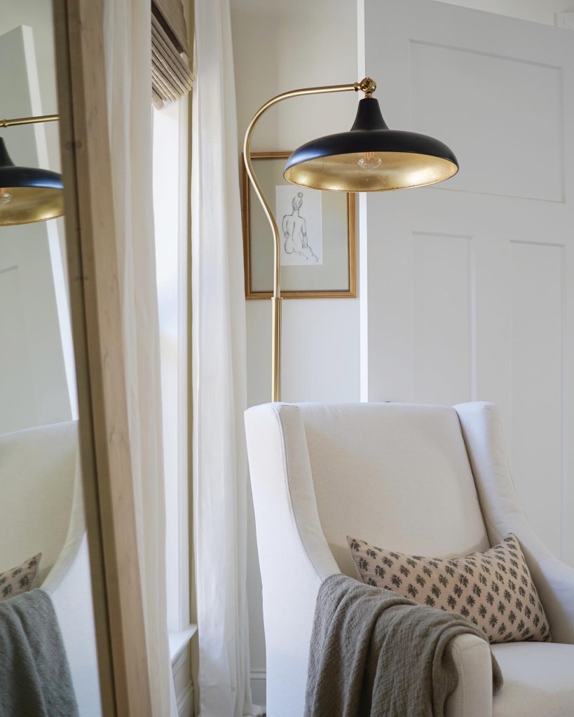 I talked about the lamp earlier, but in addition to providing task lighting for this corner, it is also a beautiful statement piece. I love the way the black and brass colors coordinate with the nightstands on the other side of the room, and how the subtle curves add another layer of softness to contrast the clean lines in the rest of the space.