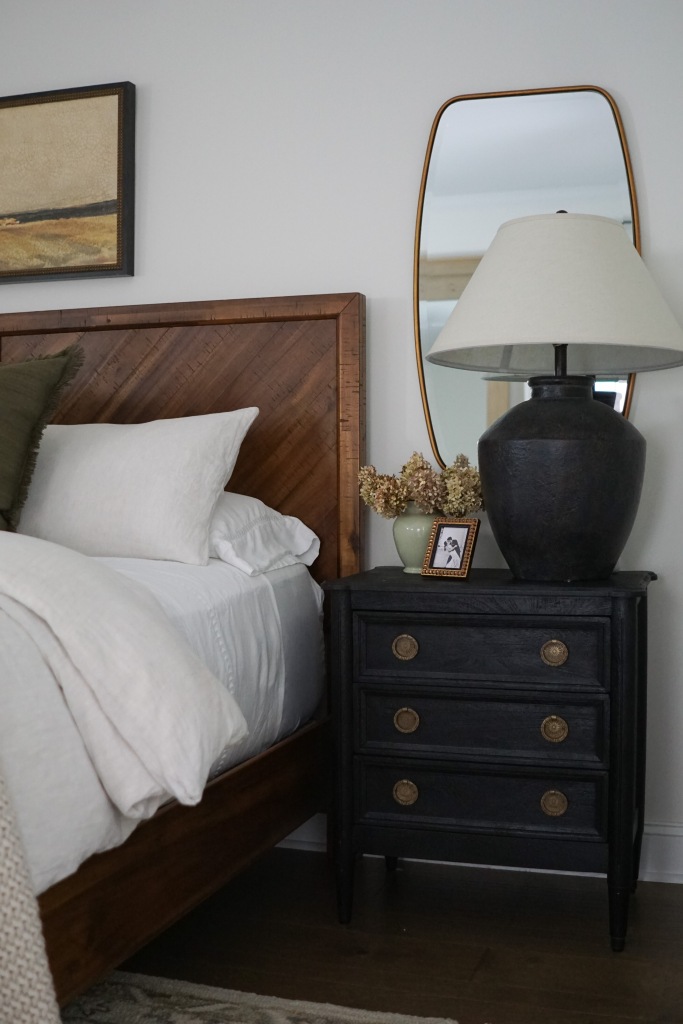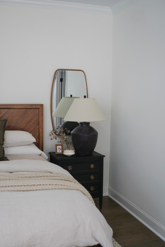 When we were deciding on a paint color for the bedroom, I was torn between Farrow and Ball’s French Gray and Benjamin Moore’s White Dove. I actually decided on French Gray originally, but after painting one wall I knew it wasn’t the right choice for our space. My husband is the real MVP though and repainted that wall and the rest of the room in White Dove. This warm, creamy white makes the space feel bright and calm while serving as the perfect backdrop for the warm woods, black and brass accents, and muted artwork.