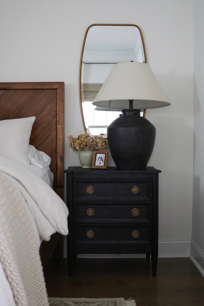 During Memorial Day Weekend of 2021, I saw one of the Anthro nightstands pop up on Facebook Marketplace for $250. Although the color was definitely not ideal, I had the idea that maybe it could be painted black. The only problem now was that there was only one listed, and I needed two. Lucky for us though, Anthro was running a Memorial Day sale at the time that brought the total down to $358 + $149 delivery. Although we were hoping to keep the total for the nightstands around $500, we decided the extra $250 was worth it, and we bought the nightstands (one from Facebook Marketplace and one directly from Anthro). They were 100% worth splurge and the work IMO, and I documented the process of spray painting the nightstands in a separate blog post that you can read if you’re interested. Just click the image below to check it out!