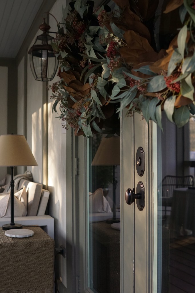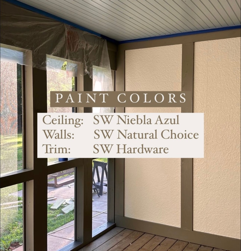 Everyone always talks about the “Power of Paint” and it’s because truly no other home improvement project gives you that kind of bang for your buck (and your time). When we bought our house, every single exterior door was a different color and the paint jobs were pretty terrible if I’m being honest. While a different colored front door can be so fun (I am seriously obsessed with Jessica Bennett’s new front door color), I wanted things to feel more cohesive, so we decided to paint all of the doors the same color: Sherwin Williams Hardware (SW 6172). Spoiler alert: this will soon be the color of all of the Tudor half-timbering too and I am so excited! It’s an earthy green-gray-brown color that looks amazing in natural light. We’ll be pairing it with Sherwin Williams Natural Choice (SW 7011) on the stucco portions and leaving the brick as is! Since our renovation included an addition and redoing the screened-in porch, half of the back of our house is actually already painted this combination of colors and I seriously love it! Here is a sneak peek from our screened in porch: