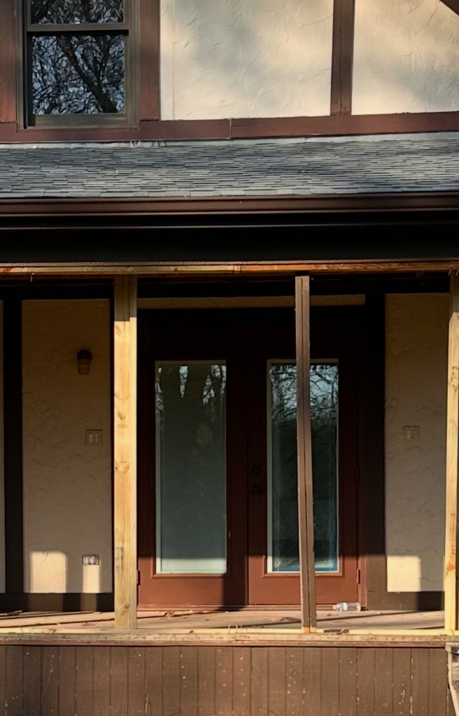 I realized as I sat down to write this blog post that I didn’t take great before pictures of our patio doors or the garage entry door, so these will have to do. If it isn’t obvious from the photos though, our exterior doors were T I R E D. The patio doors were a faded brown (that didn’t even match the Tudor half-timbering I might add) with a door knob that had fallen off and been re-attached more times than I could count. The garage entry door knob had completely broken off at some point during the renovation and the only way to open it from outside was with a pair of pliers. By the end of the renovation, the front door was the only exterior door with functioning hardware, but the finish on the handle was peeling away one layer at a time. It also had a smart deadbolt on the inside that felt bulky and out of place, as it had a different finish than the rest of the entry set. While the color of the front door wasn’t bad, the paint job was in rough shape and I wanted something a bit more muted and earthy to complement our Tudor style home.