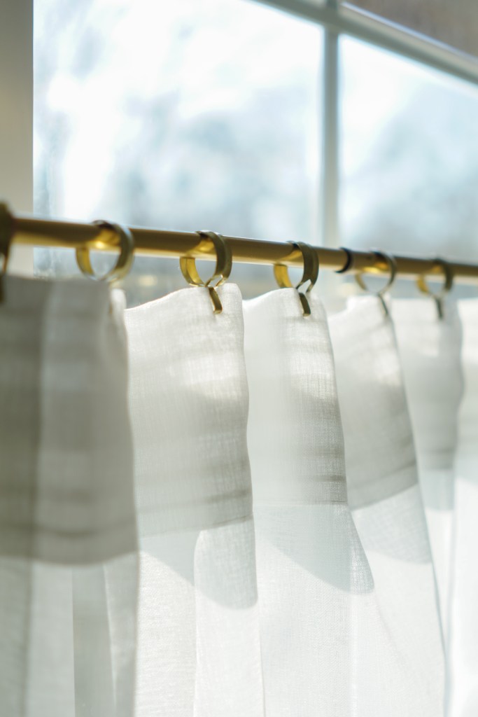 I was too intimidated to drill into our tile or grout, so we went for an easy, no drill option and used a tension rod! I ordered this one for $10 on Amazon and so far it has held up great, even with the moisture. I would eventually love to replace it with a solid, unlacquered brass option from somewhere like rejuvenation, but this one is has been great for the price. Since this was a flat panel, I used these $10 cafe curtain ring clips and just evenly spaced them along the panel (I measured with my heart and it turned out okay). I hung the rod so that the curtain was hovering just above the window sill so that it wouldn’t sit in water if any accumulated on the sill. All in all, it was a super easy install!