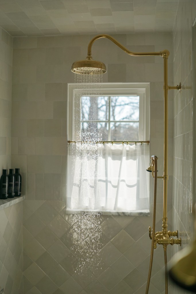 We recently renovated our primary bathroom and one thing I was SO excited about was the window in our shower. I have always wanted a shower with a window because I am a “shower in the morning” kind of girl and I LOVE natural light. Being able to wake up and hop in a sun-filled shower every morning is seriously a dream. Our bathroom windows face out into our backyard, which is relatively private, but I knew eventually I wanted to find a way to add a little privacy to our shower window without blocking the view or the natural light. So, after adding cafe curtains to other spaces in our home, I had the idea to add one to the shower! This was a bit tricky to source since it would be in a spot that is regularly exposed to water and moisture, but after a little research I found a custom, waterproof curtain option that was the perfect solution for our space! It lets in a ton of natural light, provides the perfect amount of privacy, and added so much charm and coziness to our shower. Below are all the details on the curtain we chose, how we installed it, and why we love it for our space!
